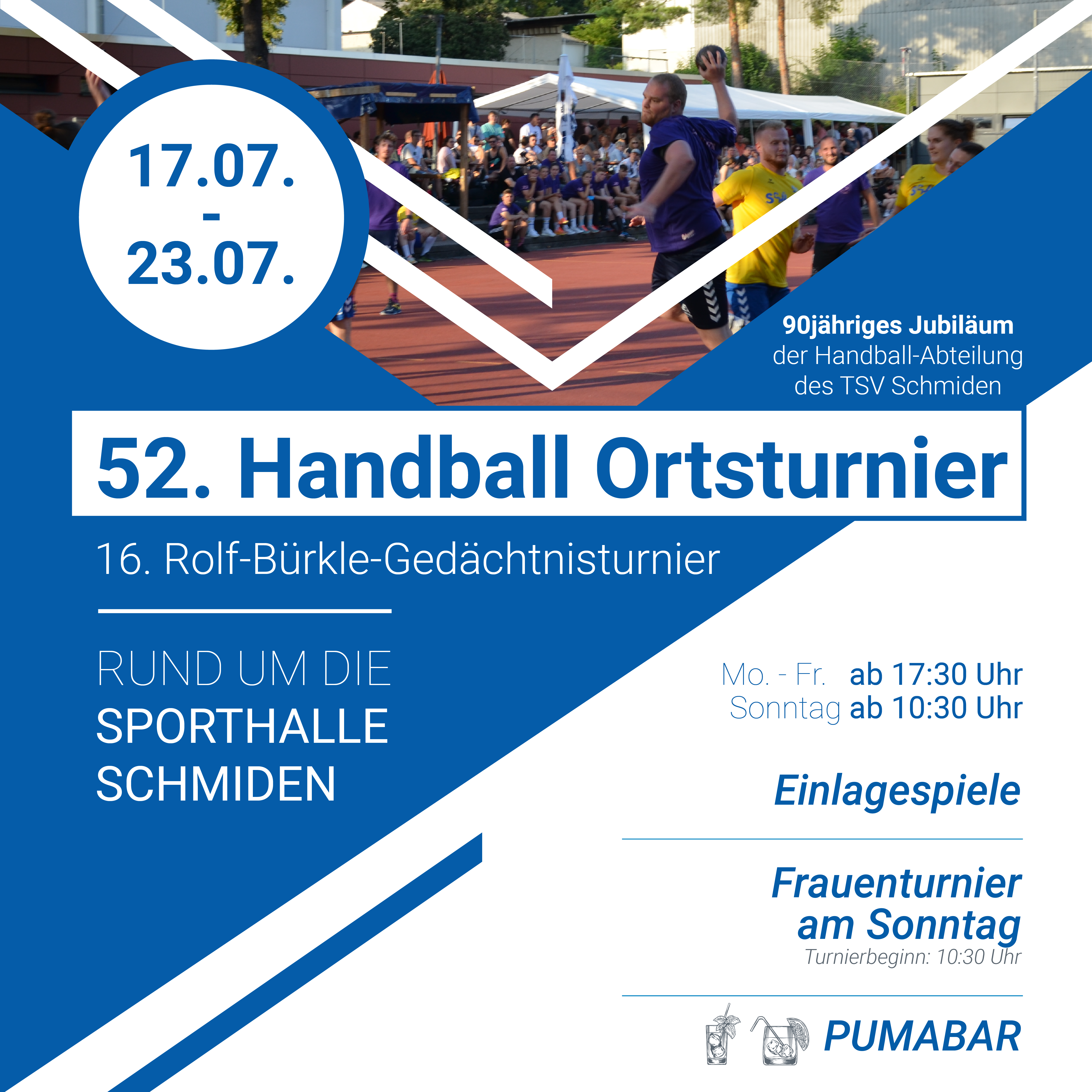 Es ist wieder soweit: das 52. Ortsturnier findet vom 17. – 23. Juli vor oder in der Sporthalle Schmiden statt. Gespielt wird von Montag bis Donnerstag mit anschließenden Einlagespielen der aktiven Mannschaften des TSV Schmiden und des HC Schmiden/Oeffingen. Freitags geht es in den Finalspielen dann um nicht mehr als ewigen Ruhm und höchstes Ansehen im gesamten Remstal. Der Turniersieg wird natürlich anschließend mit allen anderen Teilnehmern und Gästen an der Puma-Bar gefeiert.