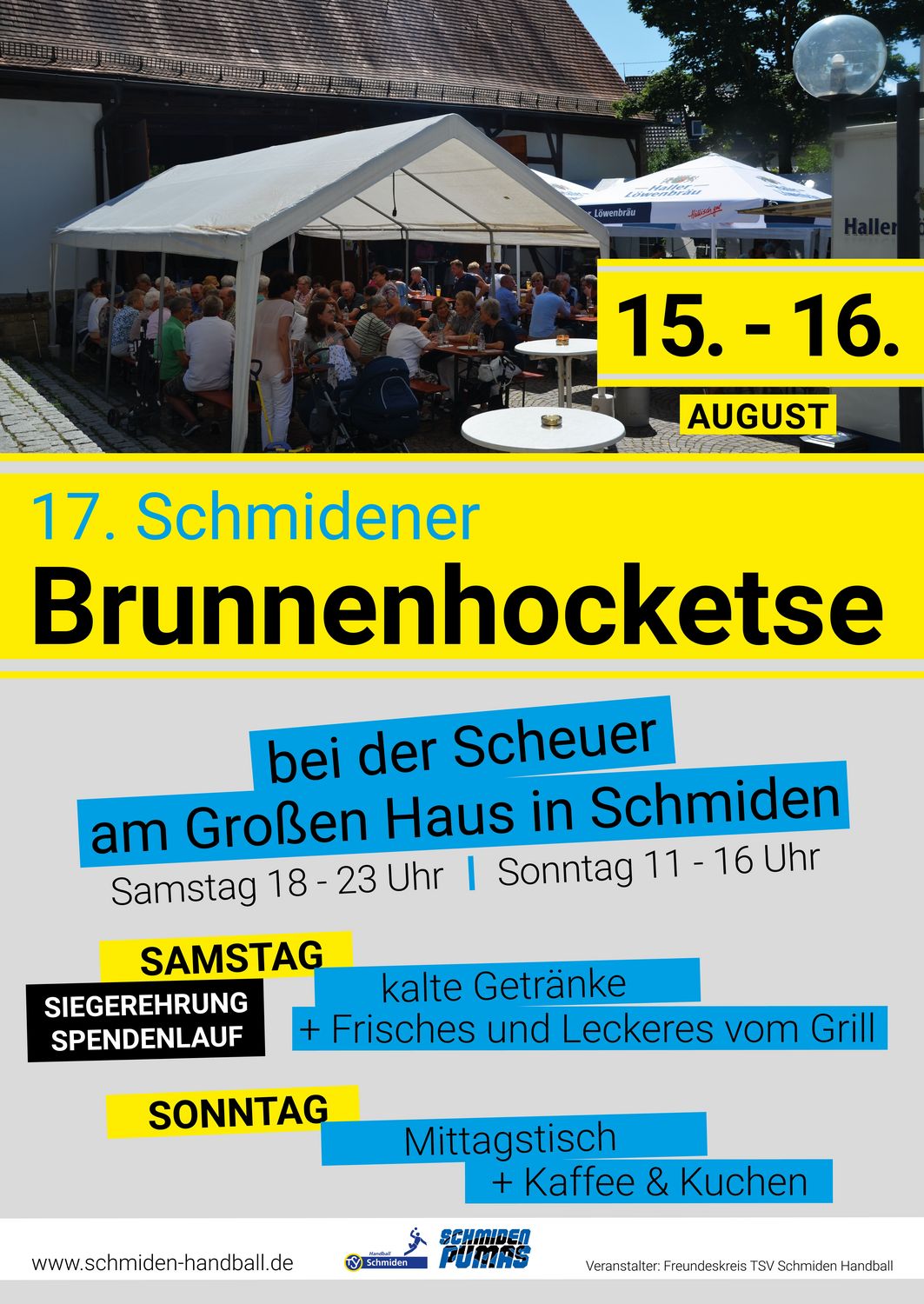 Die Schmidener Handballer veranstalten am Wochenende des 15./16. August die 17. Schmidener Brunnenhocketse am Großen Haus. Nicht wie gewohnt, sondern mit entsprechenden Vorsorge- und Hygienemaßnahmen, die von der Stadt Fellbach genehmigt wurden.