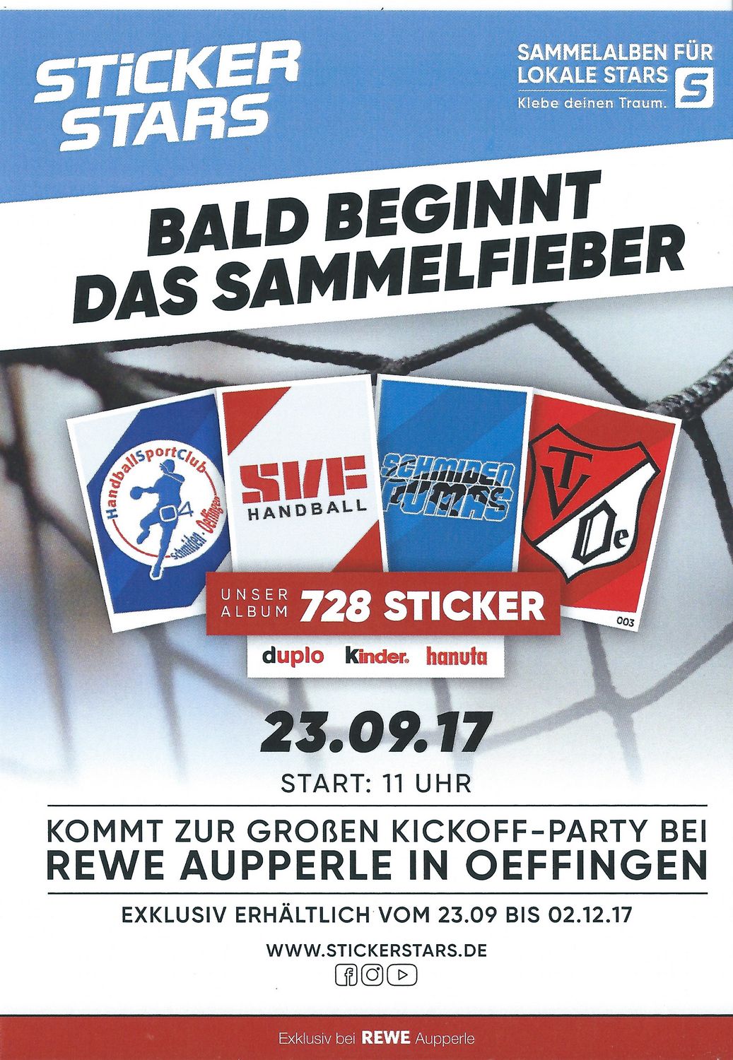 Bei der großen Kickoff-Party am Samstag, 23.09. wird unser Handball-Stickeralbum nun offiziell von Hauptsponsor Sebastian Aupperle vorgestellt. Los geht´s um 11:00 Uhr (bis 15:00 Uhr) auf dem Parkplatz des Rewe-Markts in Oeffingen. Als zusätzliche Attraktion gibt es eine Handball-Geschwindigkeits-Messanlage, an der man sich duellieren kann.